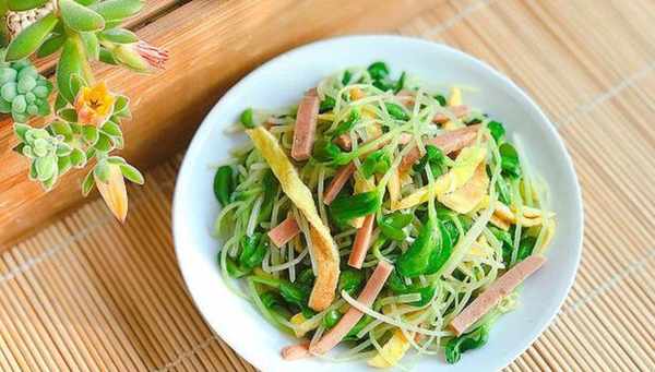 5,鍋內再次燒油,放蔥薑蒜炒出香味,再放入火腿腸,黑豆苗和雞蛋一起爆炒,一定要大火快炒,加適量鹽調味即可。