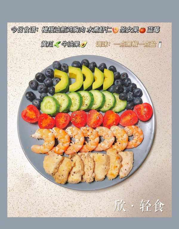 第五:橄欖油煎雞胸肉+水煮蝦仁+聖女果+藍莓+黃瓜+牛油果