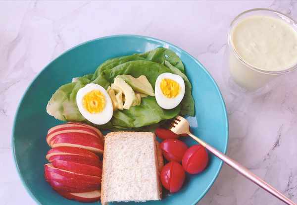 早餐一:牛油果、鵪鶉蛋、生菜、吐司、蘋果、聖女果,數一下,有6種食材搭配,這些食材都是低脂食物,再搭配一杯牛油果酸奶泥,這早餐做起來很簡單,不用下油鍋,但是它搭配得營養豐富又全面。