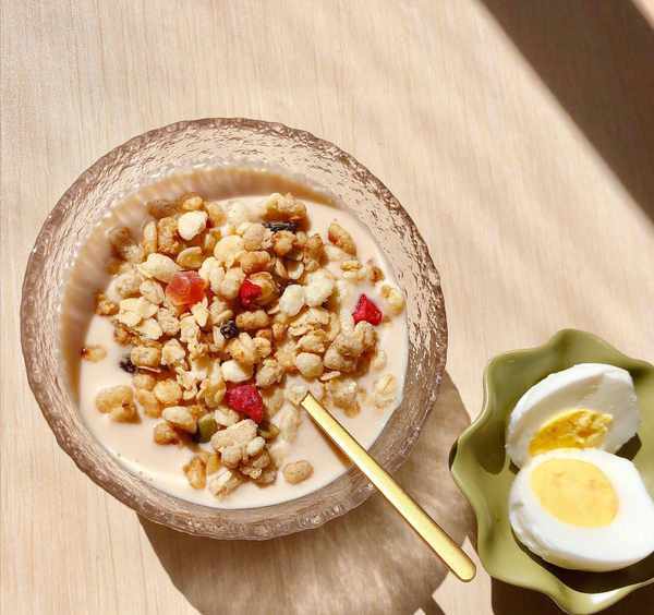 早餐二:這道早餐是我的最愛瞭,我平常早上也喜歡酸奶中加入水果燕麥,低脂美味又飽腹哦,而且水果燕麥中食材很豐富,蔓越莓、葡萄幹、草莓幹等等,再搭配一個水煮蛋,營養完全足夠哦。雞蛋能滿足人體一天所需的能量哦,而且飽腹感強,就會減少其他食物額攝入。