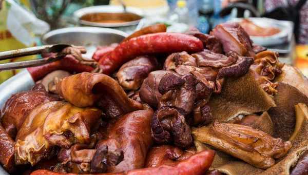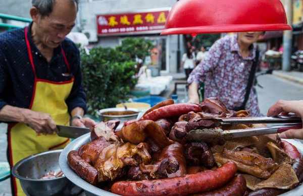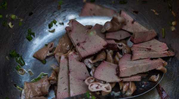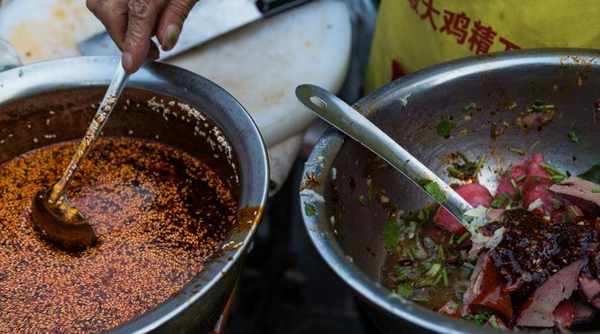 客人點單之後,老板把鹵肉切成塊,還要進行拌勻,攤子上的辣椒是亮點,他傢的辣椒油是自制的色澤金黃誘人,香味濃鬱,為鹵肉錦上添花。攤子上的豬大腸很受歡迎,幾乎是出攤就被買走,另外就是豬頭肉,同樣搶手。