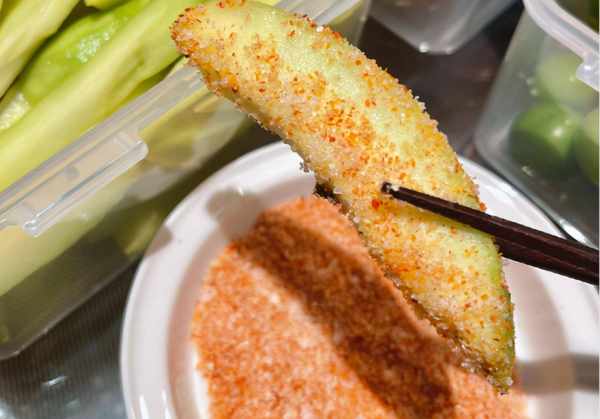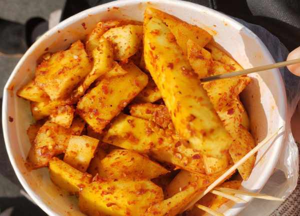 水果蘸辣椒堪稱一道雲南地域經典吃法,水果的酸甜味混雜辣椒的辣味,孕育出新的口味,深受青年群體青睞。一名雲南人士表示“在吃水果時便會蘸辣椒食用,非常好吃。”其中青芒果蘸辣椒,堪稱絕配,在雲南非常風靡這種吃法。