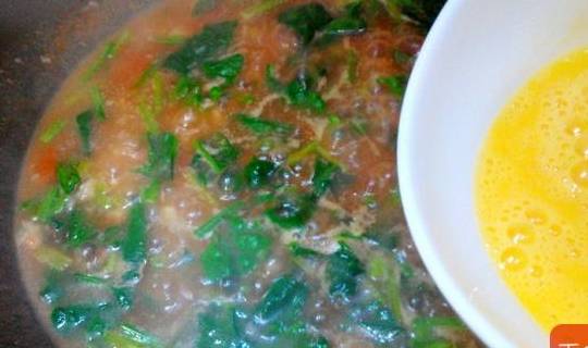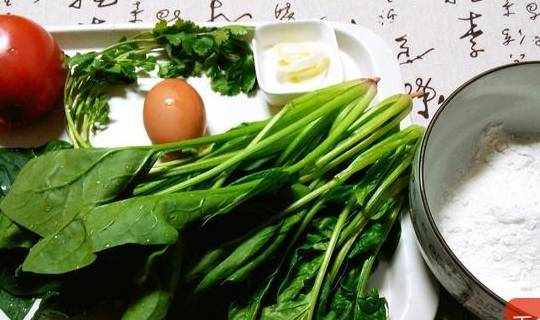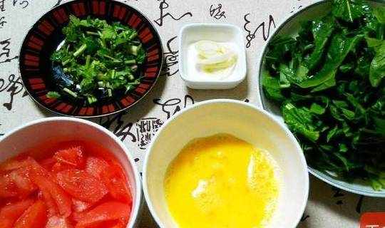 3.番茄切片,菠菜切段,雞蛋打散,蔥切花,香菜切小段