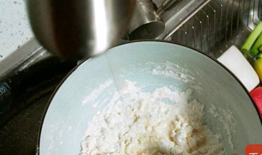 4.水龍頭呈滴水狀,滴入面粉中,用筷子攪拌