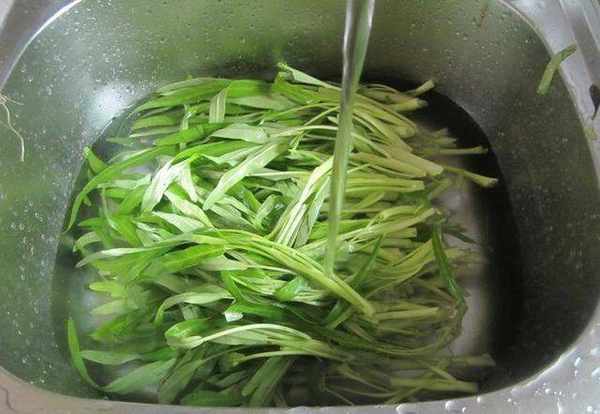 2,把通心菜放入盤中,放入清水,浸泡2分鐘後再進行清洗。洗通心菜時,要多沖洗幾遍,起碼得沖洗2-3次才能把通心菜的泥沙和臟東西洗幹凈。