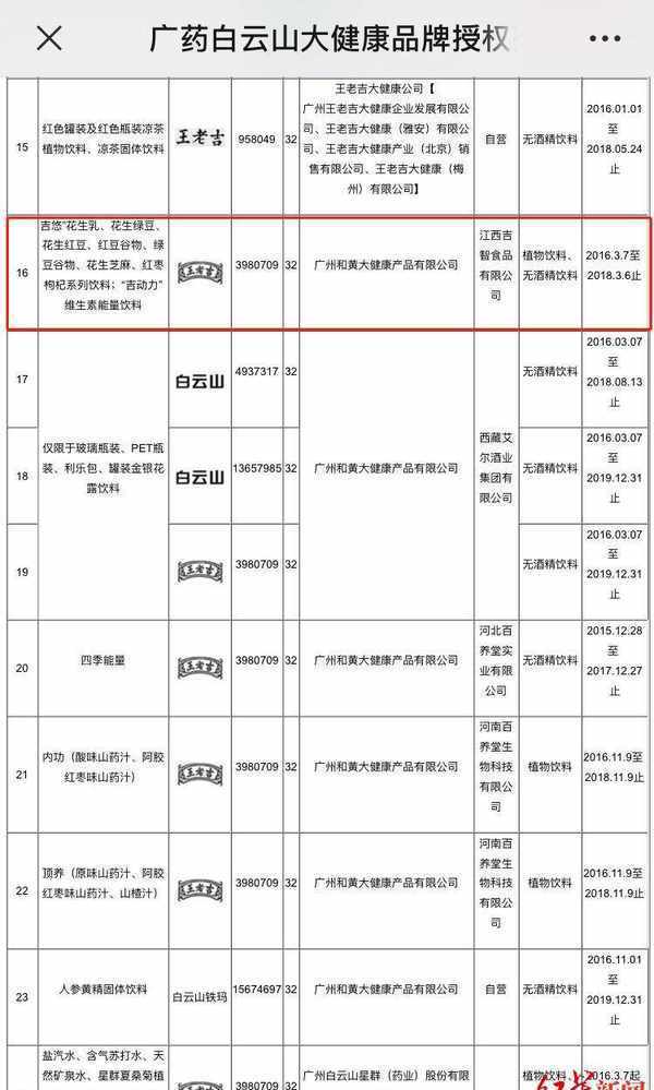 紅星資本局“1品酒”查詢廣藥白雲山大健康品牌授權發現,2016年3月廣州和黃大健康產品有限公司曾授權給江西吉智食品有限公司生產“植物飲料以及無酒精飲料”,但該項授權已在2018年3月停止,意味著“吉悠”的確曾經獲得廣藥集團授權,隻是已經過期。