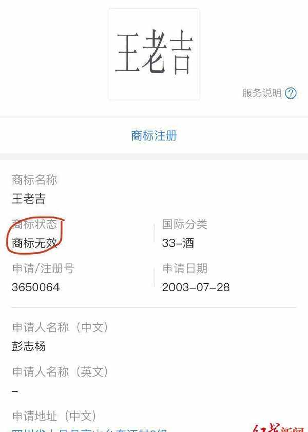有意思的是,紅星資本局“1品酒”發現,成都子雲亭酒業有限公司也曾經生產過另一款“王老吉白酒”,而且其33類酒類商標早在2003年7月就已經搶註,申請人為彭志楊。因註冊類別與廣藥集團並不相同,且註冊時間在王老吉獲評“中國馳名商標”之前,所以當年並不構成侵權。如今該類商標已經顯示“商標無效”。