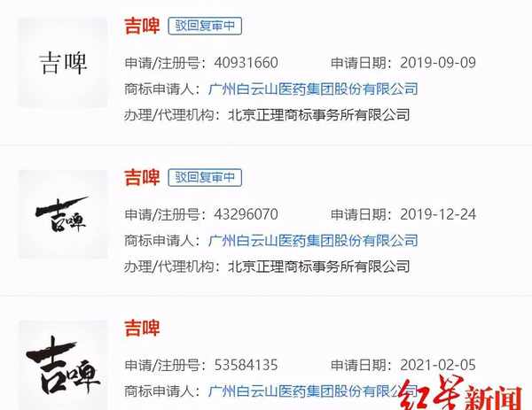 值得一提的是,王老吉啤酒還專門申請瞭一個“吉啤”商標,由廣州白雲山醫藥集團股份有限公司在2019年9月申請註冊,但是至今沒有註冊成功,目前仍處於“駁回復審”階段。天眼查APP顯示,含“吉啤”名字的公司已有多傢,分別位於廣東、黑龍江等地,有的以啤酒生產、經營為主,有的經營則與啤酒無關。