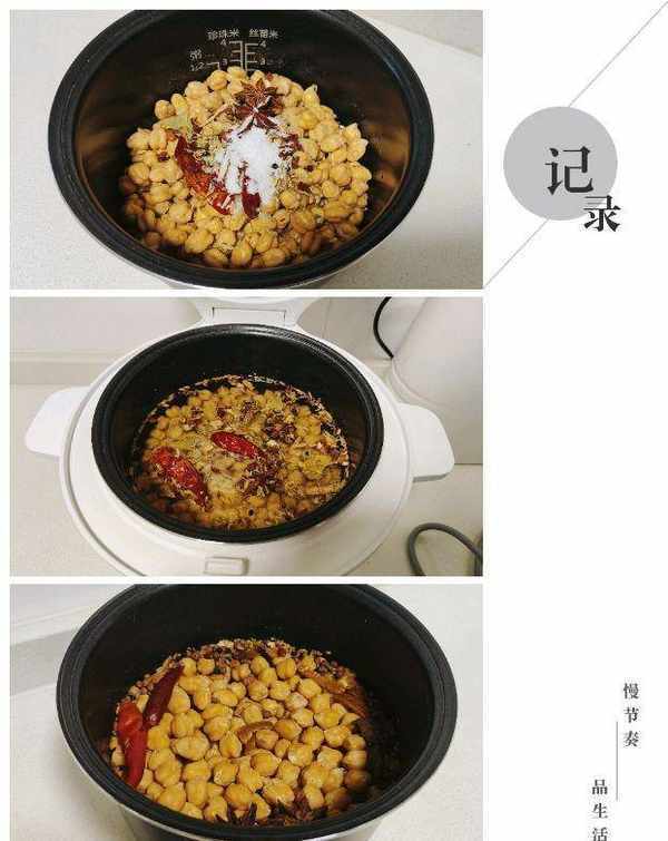 圖片中的方法燉肉調料是散著放進去的,這樣不好。因為蒸熟後還要挑出調料,太麻煩瞭,所以建議用燉肉的調料包比較方便,或者自己準備調料裝在紗佈包兒中也可以。這樣正好的鷹嘴豆兒口感咸香綿軟,每天早上吃一小碟方便又健康。