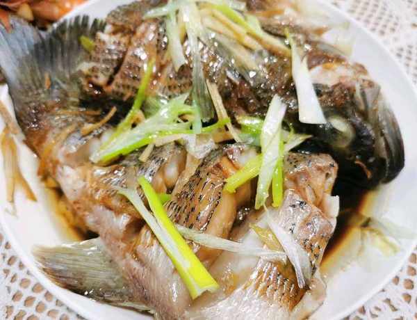 3,魚蒸好之後取出來,把魚身上的蔥薑絲去掉,倒掉盤子裡的湯水,然後淋上一些蒸魚豉油,再回鍋蒸30秒後立刻出鍋出來,接著重新撒上蔥薑絲,再澆一勺熱油就可以上桌瞭。
