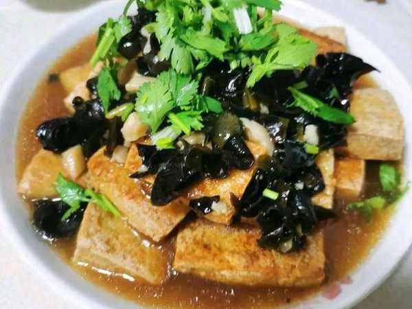 4,鍋裡留底油,燒熱後把蔥薑蒜下鍋爆香,然後倒入木耳翻炒幾下,再把調好的料汁倒進去,炒至濃稠的時候倒在豆腐上就可以瞭。