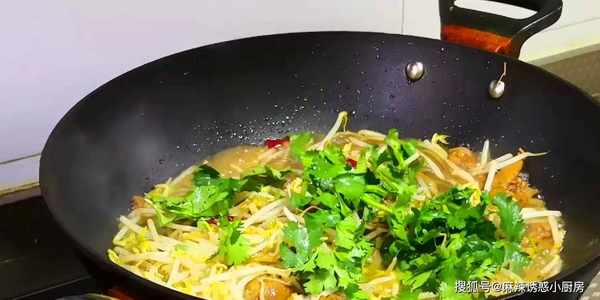 時間到瞭以後,我們再調一下味:加入適量的鹽、味極鮮、香菜段,翻炒均勻後關火出鍋。