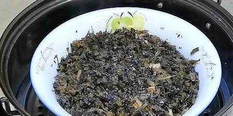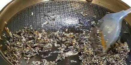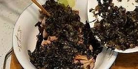 5、在鍋裡剩下的油裡,放入花椒和鹽菜翻炒兩分鐘左右,盛出來。