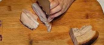 6、把冷卻的五花肉切片,肥瘦要連在一起,盡量切得薄一點,切好以後全部擺放到一個大碗裡。