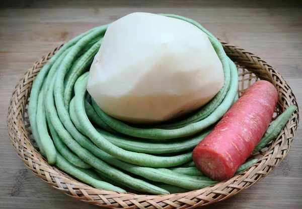 3、鍋中燒水,放入豆角,土豆,胡蘿卜焯5分鐘,再放入少許鹽,一起再焯三分鐘撈出,過涼水。