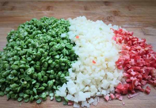 2、土豆、胡蘿卜、豇豆,洗幹凈最後都切成小粒,再沖洗一遍,控掉多餘水分。