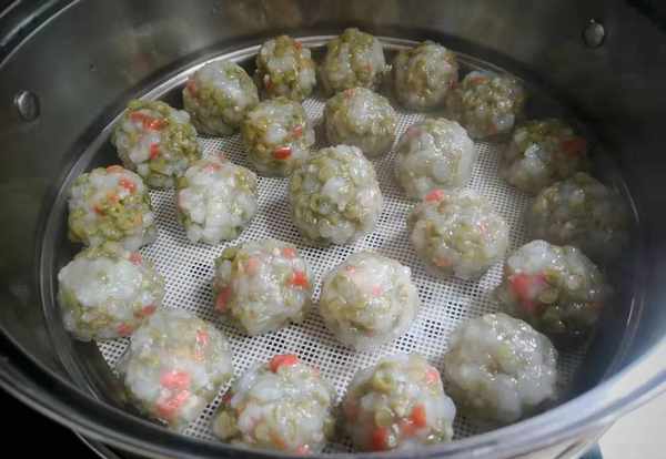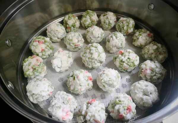 6、鍋中燒適量水,把丸子放到篦子上,每個丸子之間留出空隙,防止蒸熟粘連在一起。