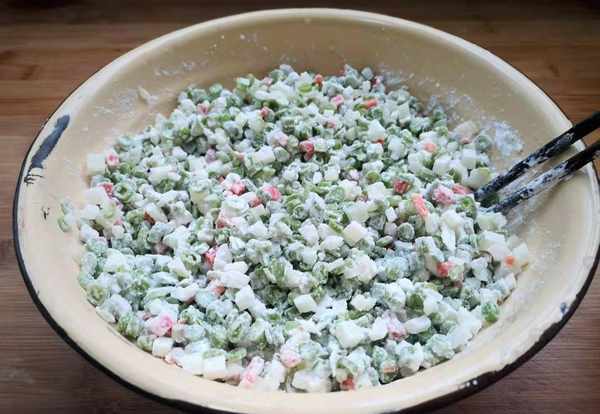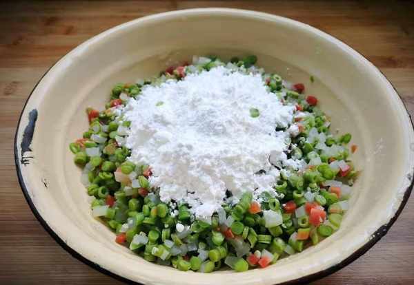 4、豇豆撈出裝入盆中,加入適量土豆淀粉抓勻,多次少量加入,起到粘合作用。