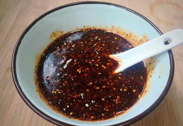 8、再來調個料汁,碗中放入蒜泥,加生抽,香醋,香油,雞精,辣椒油拌勻。