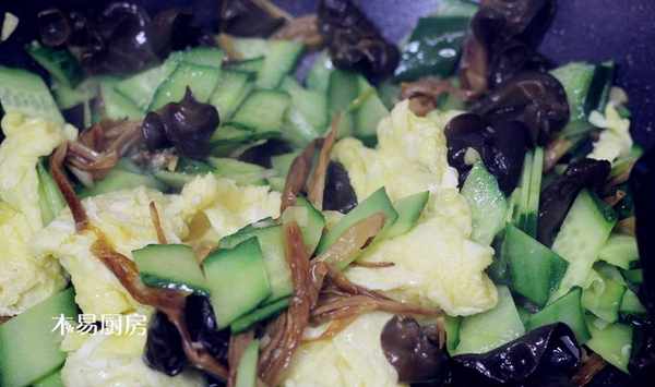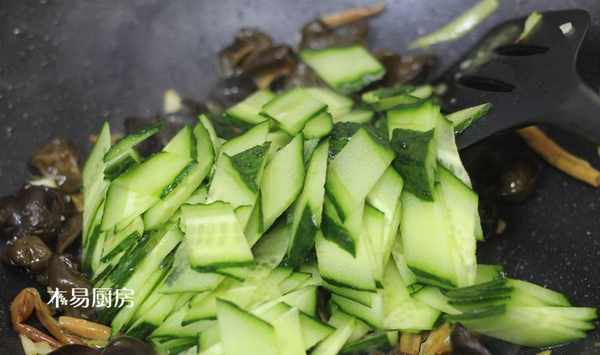 放入黃花菜和黃瓜片,翻炒2分鐘,至木耳炒熟。