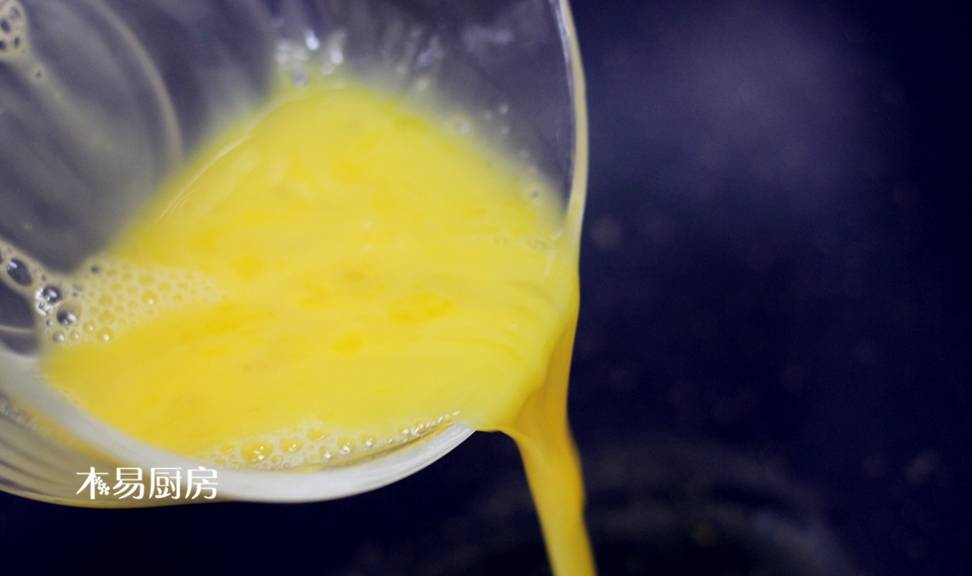 鍋內放油,7成熱時轉小火,倒入雞蛋液滑散。