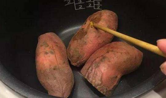 2.在購買紅薯的時候,建議大傢買小一點的。如果紅薯太大,也不用擔心,可以把紅薯切成塊,讓帶皮的一面朝下。