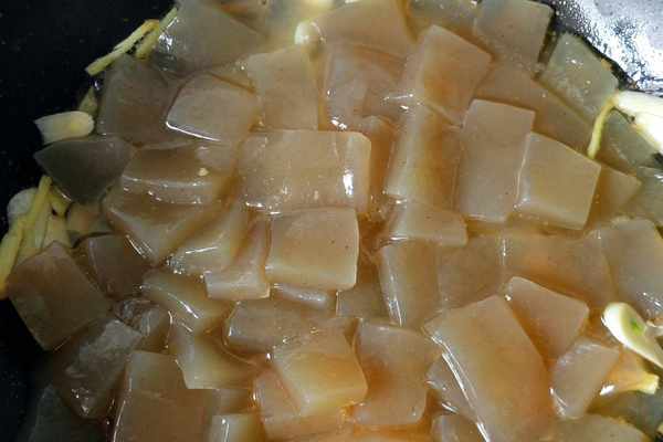 步驟四:鍋內放清水,水開後放入魔芋豆腐,焯水30秒撈出,焯水的作用是去掉魔芋豆腐裡面的堿味,這樣做出來的魔芋豆腐嫩滑不澀口。