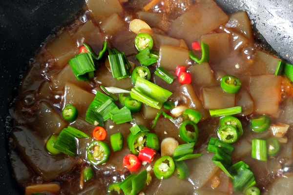 【準備食材】:魔芋豆腐500g,杭椒一個,小米椒一個,大蒜苗一根,生薑一塊,大蒜三瓣,泡辣椒適量。