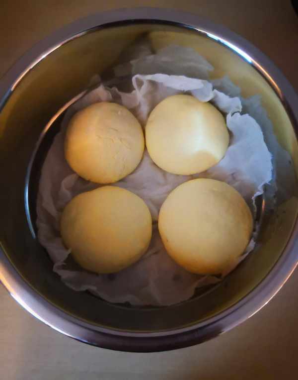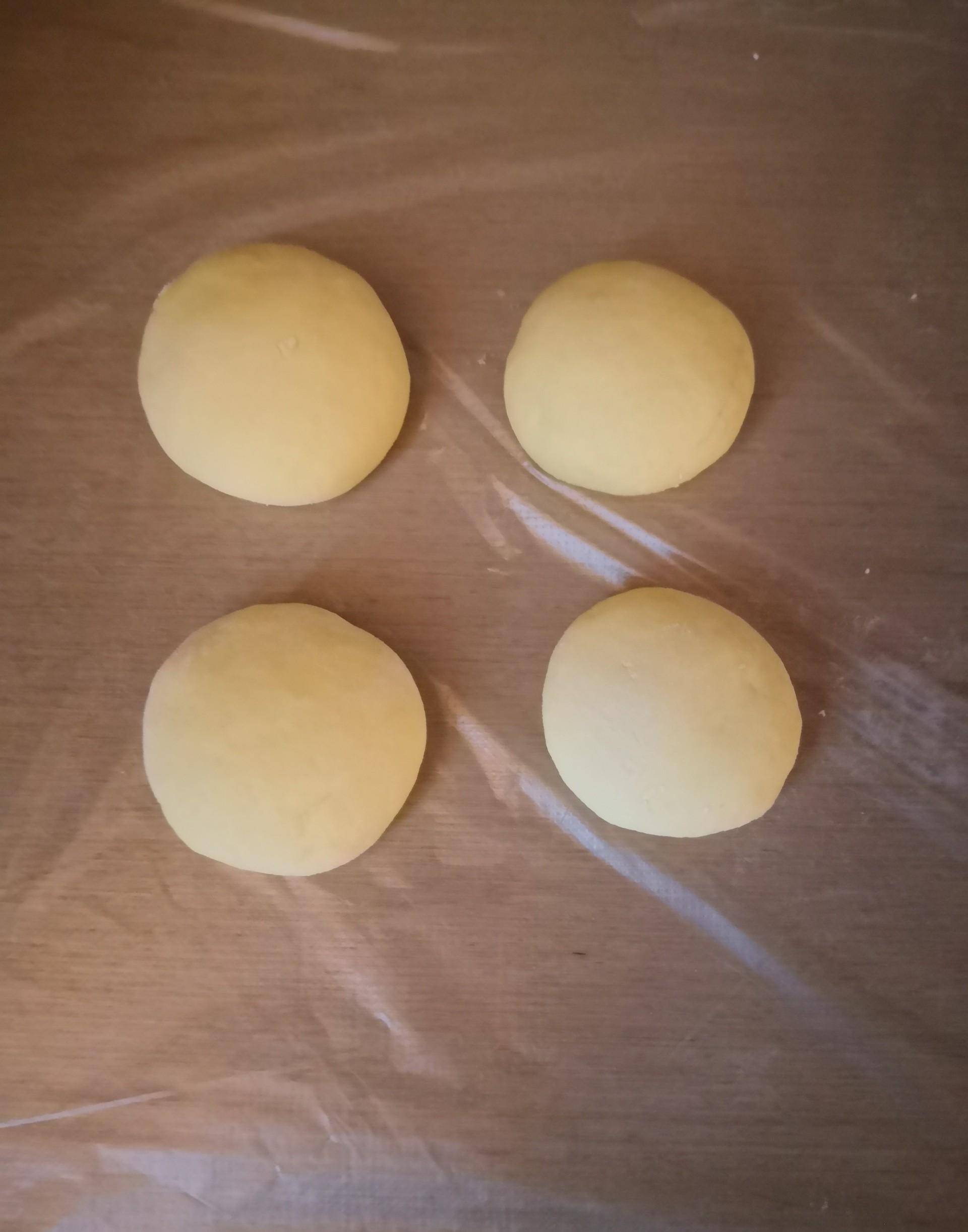 把保鮮袋撕開,墊在桌上,取出面團揉面排氣,分成大小均勻的面劑子再分別揉搓成圓。
