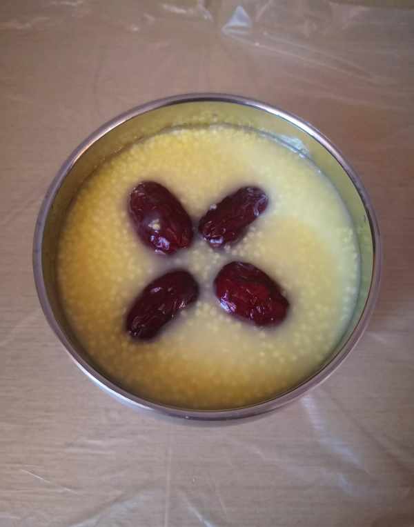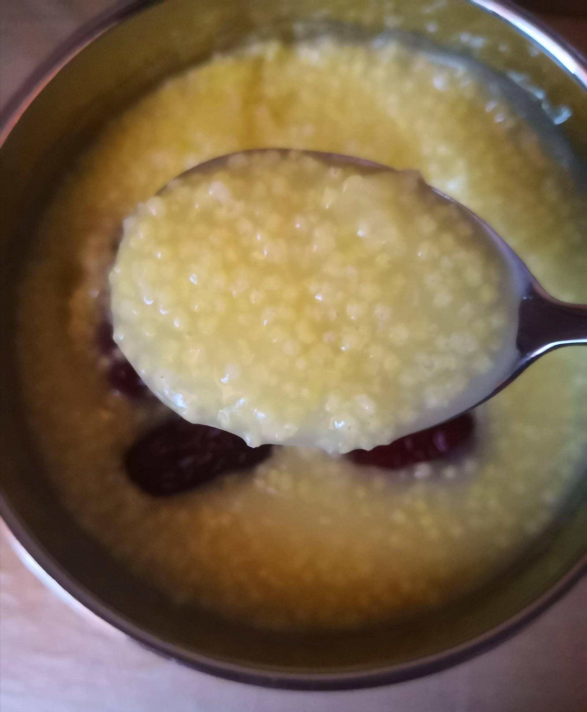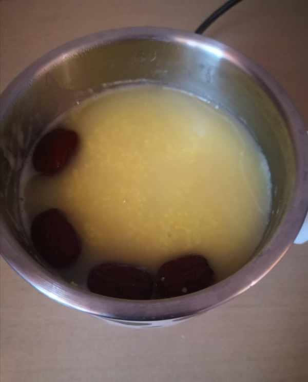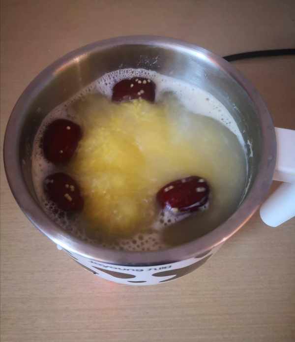 水開後倒入清洗幹凈的小米,加幾個紅棗,煮開後繼續煮。