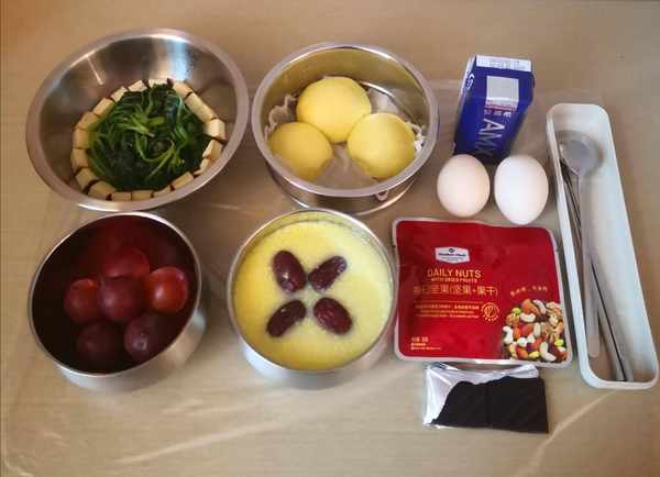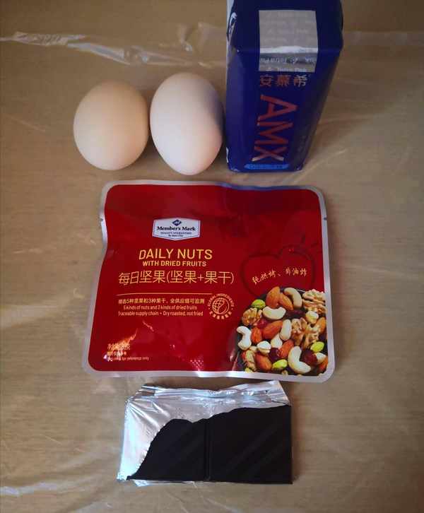 酸奶、雞蛋、每日堅果、兩小塊黑巧克力。