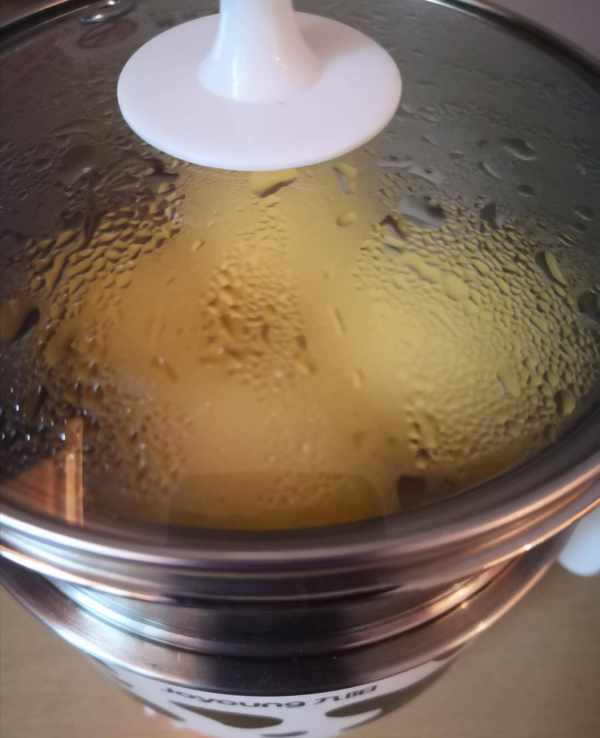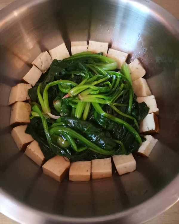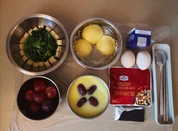 我已經迫不及待吃瞭一個饅頭,粥煮好後盛出晾涼,晾涼的時間煮菜、洗水果,不一會兒,一頓豐盛的早餐就做好瞭,我特別喜歡這樣的早餐,清淡味美、營養豐富!
