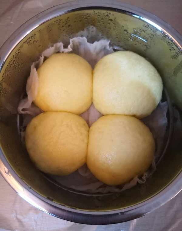 放上蒸籠,墊上蒸佈,把饅頭生胚放進鍋裡,因鍋太小,隻能挨著放。