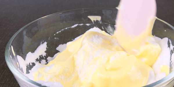 4.將三分之一的蛋白霜放入蛋黃的碗中攪拌均勻,將攪拌好的蛋糊倒入剩下的蛋白霜碗中進行翻拌。這裡再提醒一下小夥伴們,要翻拌或者切拌,千萬不要畫圈,不然就消泡瞭。