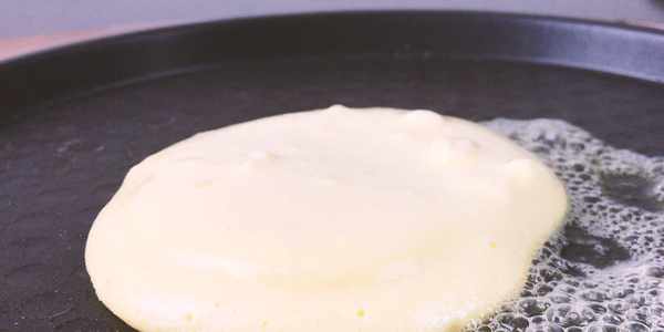5.電餅鐺刷上一層薄薄的食用油,倒入攪拌好的蛋糊形成一個圓形,放入一小塊黃油潤底滑鍋。