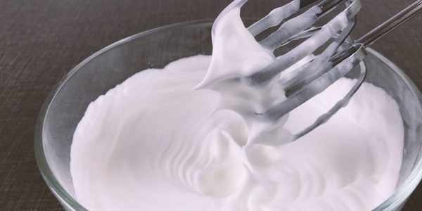 3.在蛋清中加入檸檬汁加入一勺白砂糖,打發至起泡狀態,再加入一勺白砂糖,繼續打發至有明顯紋路再加入一勺白砂糖,一直打發至這種有直立尖角狀態,蛋白霜就打發好瞭。