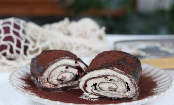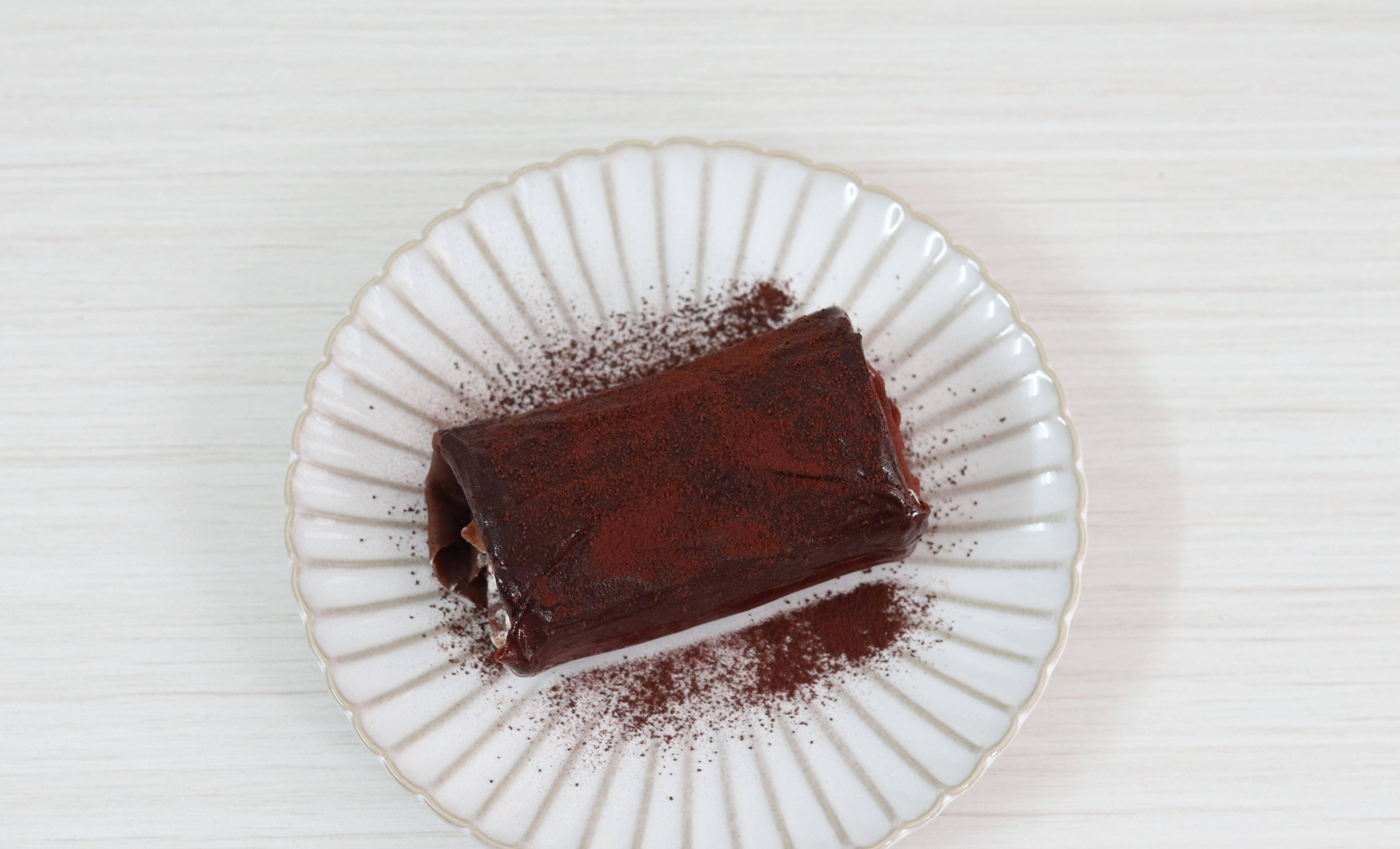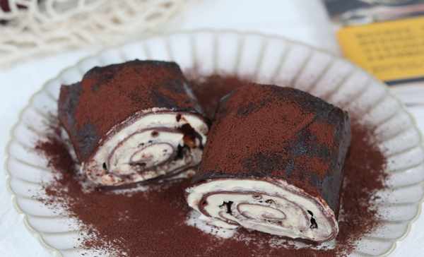 9 毛巾卷卷好以後,擺在盤子裡。表面刷一層巧克力醬,最後撒上可可粉做裝飾即可。