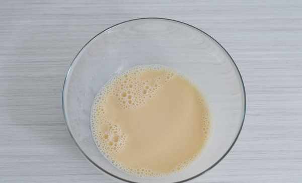 1 雞蛋、牛奶、玉米油、細砂糖放入大碗裡,攪打均勻。