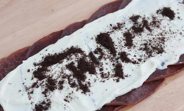 7 取5張餅皮並排擺放,鋪上淡奶油,再撒上適量奧利奧餅幹碎。
