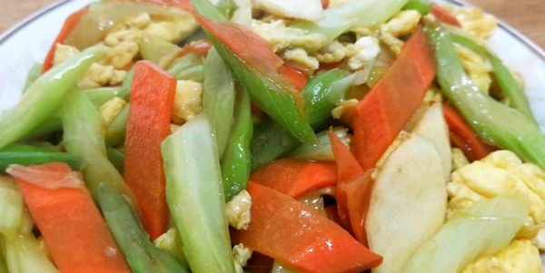 6、最後,在出鍋前倒入炒好的雞蛋碎,將蔬菜與雞蛋碎一起翻拌均勻,在簡單炒制後就可以出鍋裝盤瞭。這樣,非常好吃又簡單的炒芹菜就做好瞭!經過殺水以後炒出來的芹菜非常的清脆,而搭配瞭胡蘿卜、雞蛋、山藥,也讓這道菜非常的有營養,如果喜歡的話就趕緊試試吧!經過殺水以後,炒出來的芹菜口感非常的清脆,而搭配瞭胡蘿卜、山藥、雞蛋,這道菜也是非常的富有營養,如果喜歡的話,就趕緊在傢裡試試吧。