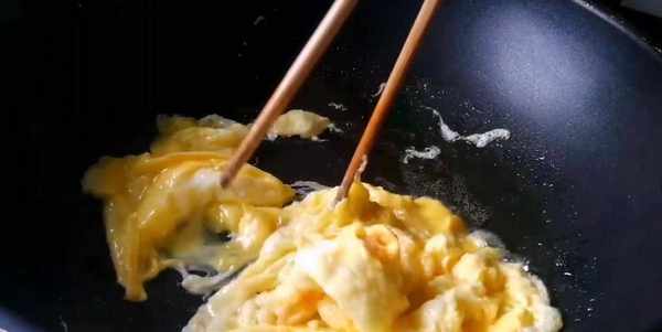3、如果隻加蔬菜,味道與口感未免過於單調,於是我們可以為這道菜增添一些獨特的風味。將三個雞蛋打入碗中,用筷子將雞蛋充分打散成雞蛋液。熱鍋,向鍋中倒油,在油熱後把雞蛋液倒進去,直接在炒制過程中用筷子把還未成型的雞蛋劃散成雞蛋碎,炒熟之後盛出來備用。至此,我們的原料準備就到此為止瞭,接下來就該正式炒菜瞭!