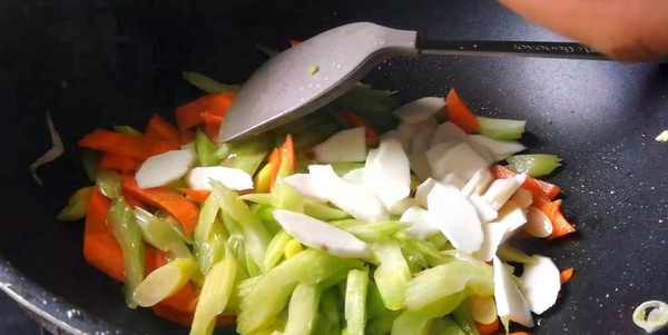 4、在剛才炒制雞蛋碎的鍋中倒一點底油,倒入剛才準備好的蔥段,先簡單翻炒,把蔥段炒香。在蔥炒香之後,倒入胡蘿卜片,倒入殺過水的芹菜桿,最後加入瀝過水的山藥片,一起在鍋中翻炒。