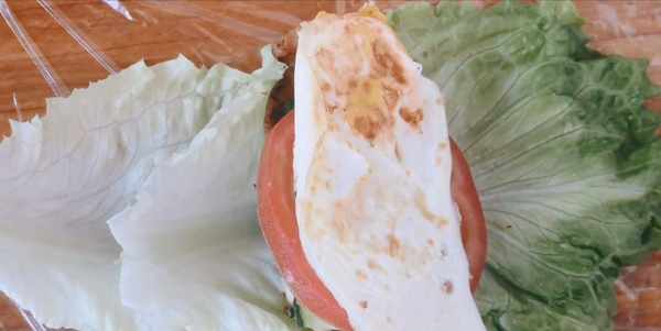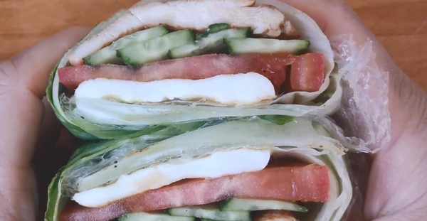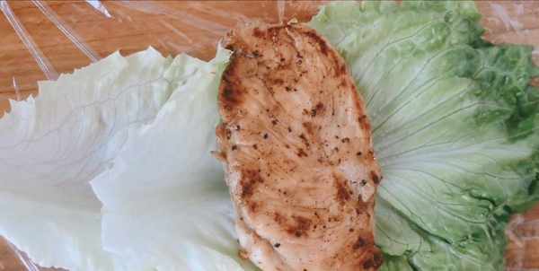 第三步:撕下保鮮膜平鋪在桌面上。取出洗凈的兩片生菜葉子,碼上雞胸肉、黃瓜片,番茄切片,煎蛋。