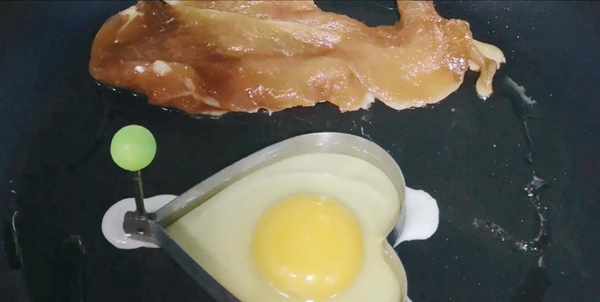 第二步:早上起來用不沾鍋把雞肉和雞蛋煎熟。不要放油喲。雞蛋上撒少許鹽,雞肉上撒黑胡椒粒。