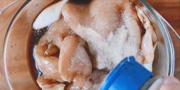 第一步:雞胸肉提前一天晚上用蔥薑,鹽,糖,料酒,蠔油,醬油,胡椒粉醃上,放冰箱冷藏一晚。