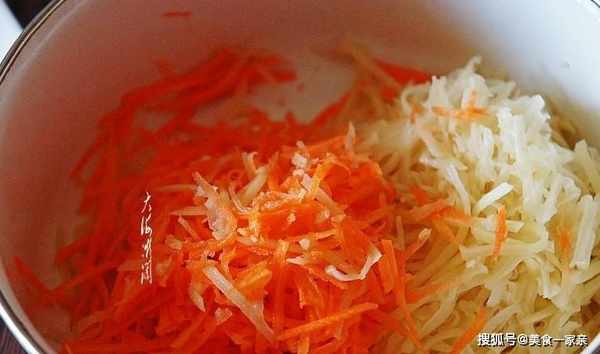 2、土豆和胡蘿卜分別用擦絲器擦成絲,加入鹽、胡椒粉調味。