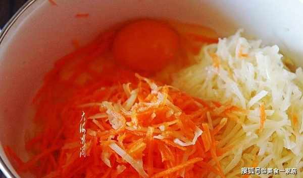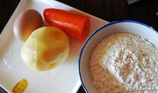 【土豆雞蛋餅】所需食材:胡蘿卜半根;土豆1個;雞蛋2個;面粉100g;油適量;鹽適量;胡椒粉適量;蔥適量。