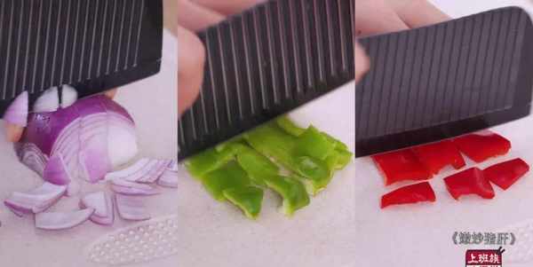 切洋蔥塊、青椒塊、紅椒塊備用。