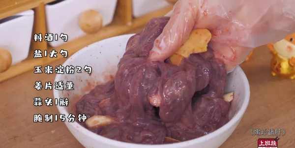 加入2倍的鹽、1勺料酒、2勺淀粉、薑片適量、一瓣蒜頭,醃制15分鐘。