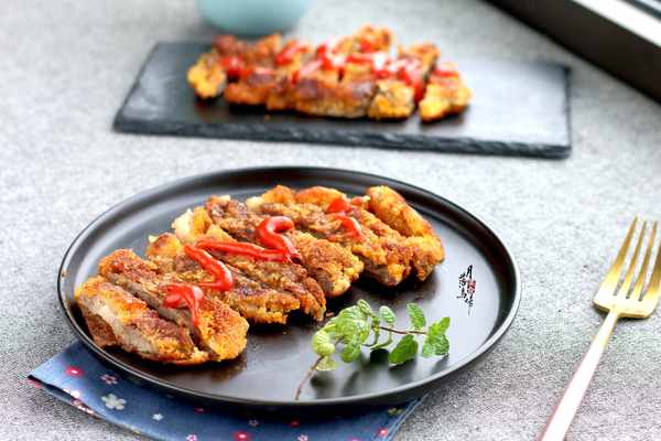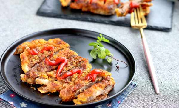 接下去準備3個容器,分別裝上玉米淀粉、蛋液,面包糠,每片牛排依次“過三關”:沾上玉米淀粉、蛋液和面包糠。